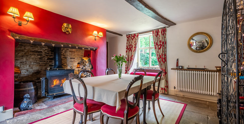 A separate dining room offers a more formal setting, showcasing original flagstone flooring and a striking inglenook fireplace with a wood burning stove - adding warmth and ambience. To the front, a generous sitting room provides a refined space for relaxing, also complete with a wood burner. Additional ground floor features include a convenient WC and access to a cellar below - perfect for storage or potential wine cellar use.